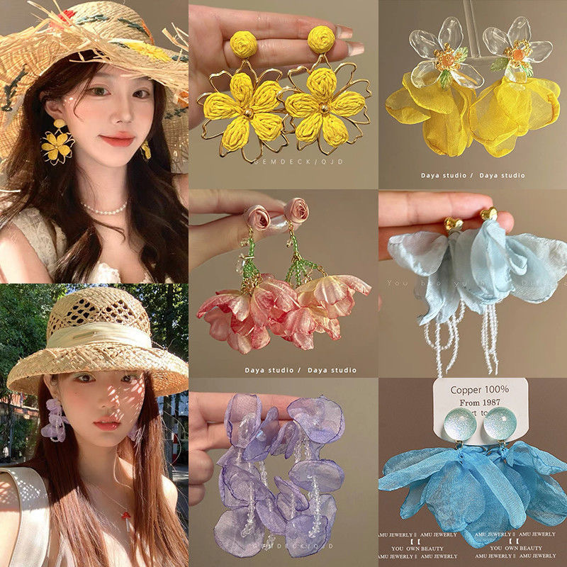 2026年度假风超仙氛围感网纱花朵耳环女温柔气质雪纺森系耳钉耳饰